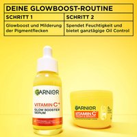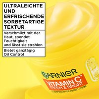 Die Vitamin C Fresh & Bright Glow Booster Sorbet Creme von Garnier ist eine Vitamin-C-Feuchtigkeitscreme für das Gesicht. Ihre Formel kombiniert Vitamin C mit 4% Niacinamid, wodurch dunkle Flecken nach und nach aufgehellt werden. Dabei spendet die Vitamin C Creme nicht nur Feuchtigkeit, sondern unterstützt auch einen ebenmäßigen und strahlenden Teint. Die Glow-boostende Creme zieht zudem schnell ein und hinterlässt ein angenehmes Hautgefühl – ohne zu kleben oder zu fetten.